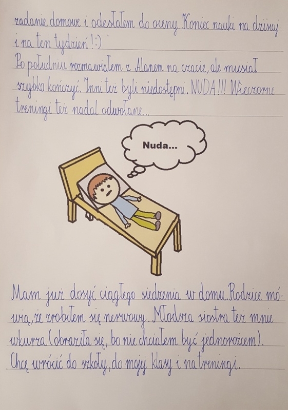 Dnia 25 marca 2021 roku został rozstrzygnięty Wojewódzki konkurs polonistyczny z elementami grafiki komputerowej „Zdolni w zdalnej szkole – jeden dzień online ucznia”. Zadanie konkursowe polegało na napisaniu i zilustrowaniu jednego dnia z życia nauki online w formie kartki z pamiętnika. Miło nam poinformować o wyróżnieniu, które zdobył trzecioklasista – Ksawery Kuśmierski .
