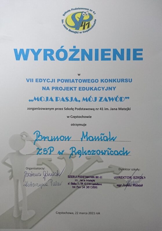 Uczeń naszej szkoły – Brunon Maniak otrzymał wyróżnienie w POWIATOWYM KONKURSIE NA PROJEKT EDUKACYJNY „ MOJA PASJA, MÓJ ZAWÓD” zorganizowanym przez Szkołę Podstawową nr 41 im. Jana Matejki w Częstochowie. Brunon w ramach zajęć doradztwa zawodowego wykonał prezentację multimedialną dotyczącą swojego przyszłego zawodu. Praca konkursowa przedstawiała ścieżkę kariery zawodowej ucznia od szkoły ponadpodstawowej do celowego zawodu.