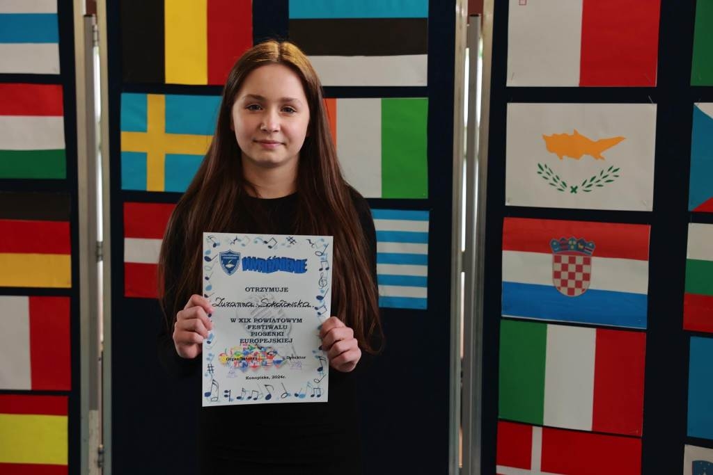 W dniu 24.04.2024 r. uczennice Zuzanna Sokołowska z kl. VI oraz Kamila Pyrkosz z kl. VII wzięły udział w XIX Powiatowym Festiwalu Piosenki Europejskiej w Konopiskach. Miło nam poinformować, że uczennica Zuzanna Sokołowska zdobyła wyróżnienie za wykonanie piosenki pt. „My heart will go on”. Kamila Pyrkosz wykonała piosenkę pt. „Riptide”.