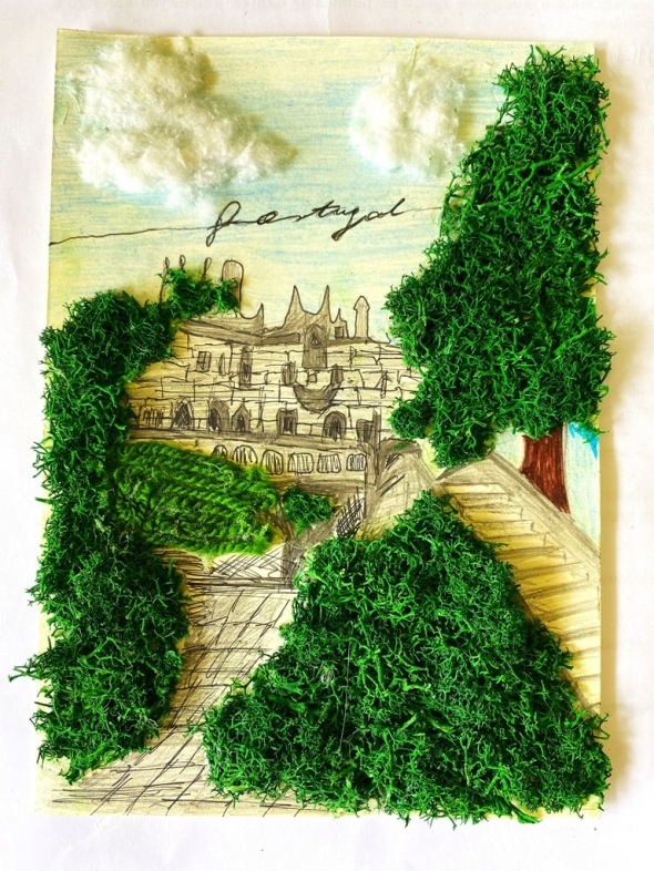 Poniżej prezentujemy przepięknie wykonaną pocztówkę Leny Kuc, na której można zobaczyć pałac Quinta da Regaleira znajdujący się w miejscowości Sintra w Portugalii. Rezydencja oraz park znajdujący się w pobliżu zabytkowego centrum miasta Sintra, w Portugalii jest wpisany na Listę światowego dziedzictwa UNESCO.