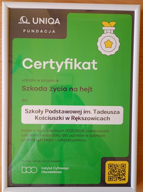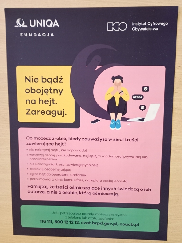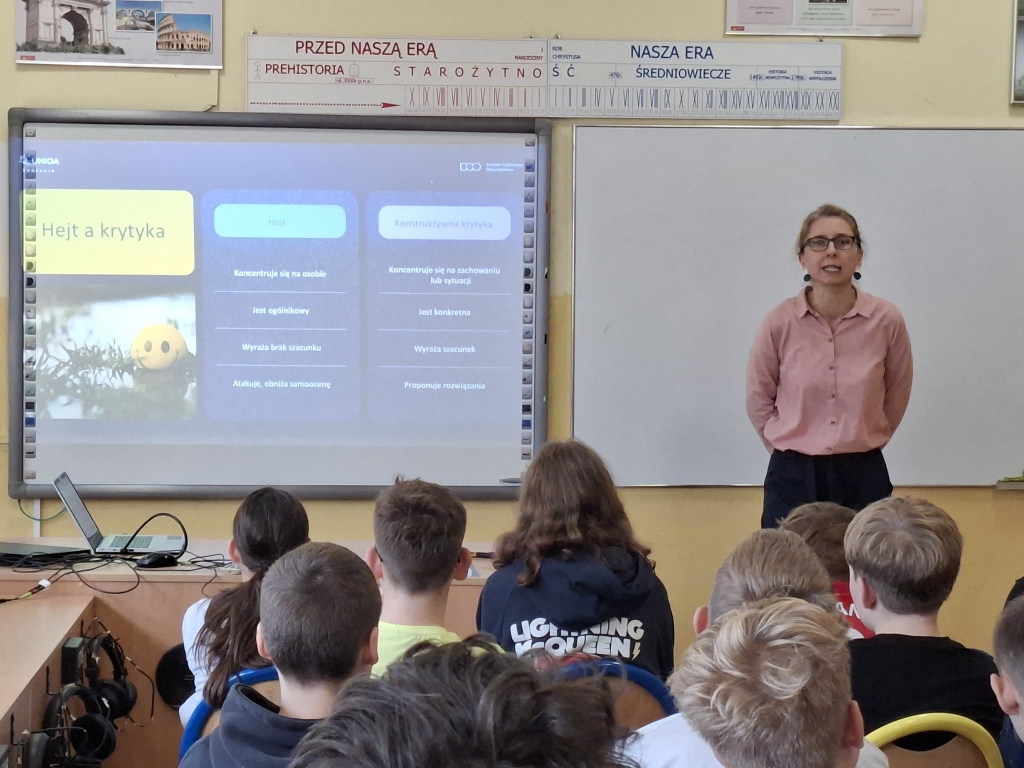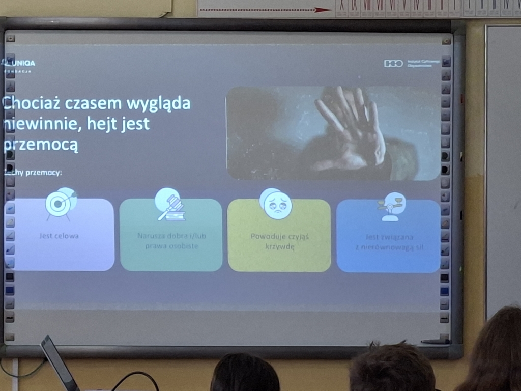 28 października w naszej szkole w ramach programu Fundacji UNIQA „Szkoda życia na hejt” przeprowadzone zostały wykłady i warsztaty dla uczniów, nauczycieli i rodziców, podczas których uczestnicy dowiedzieli się, czym jest hejt, jak go rozpoznać i jak mu przeciwdziałać.