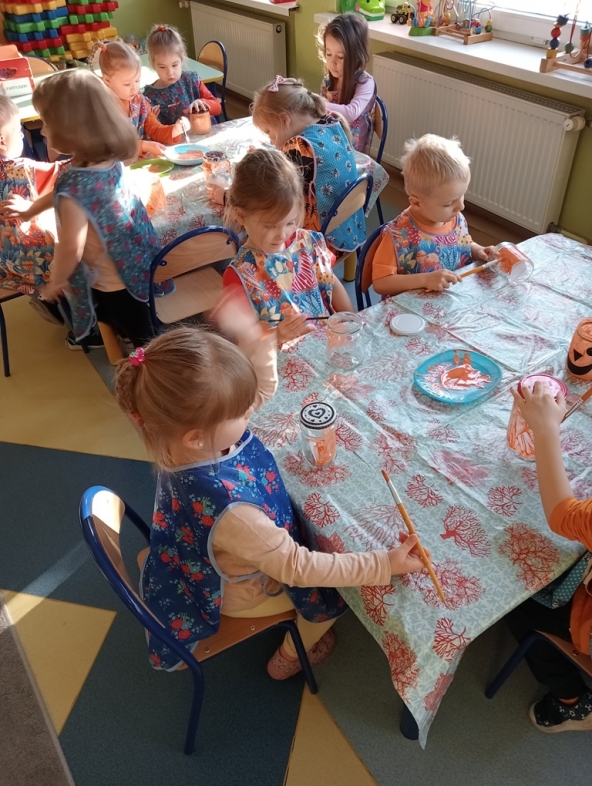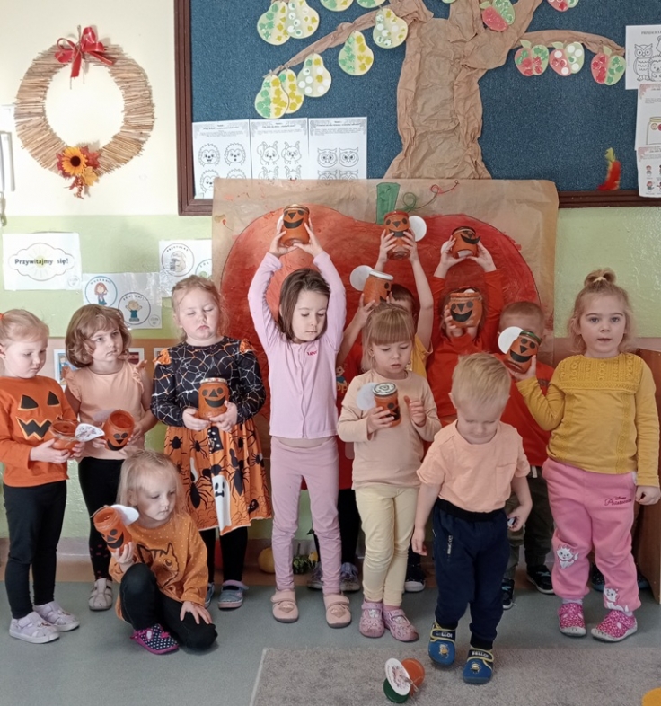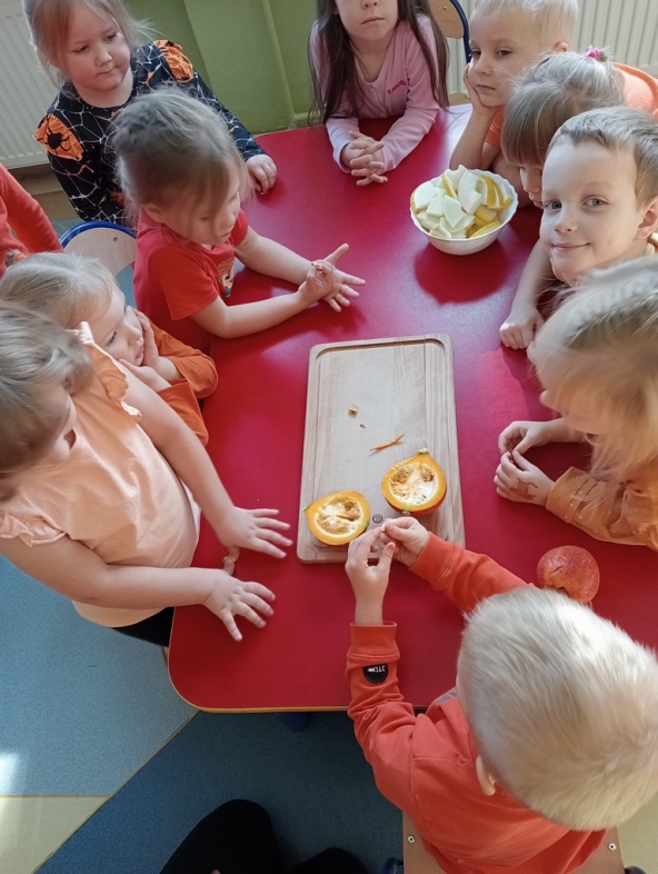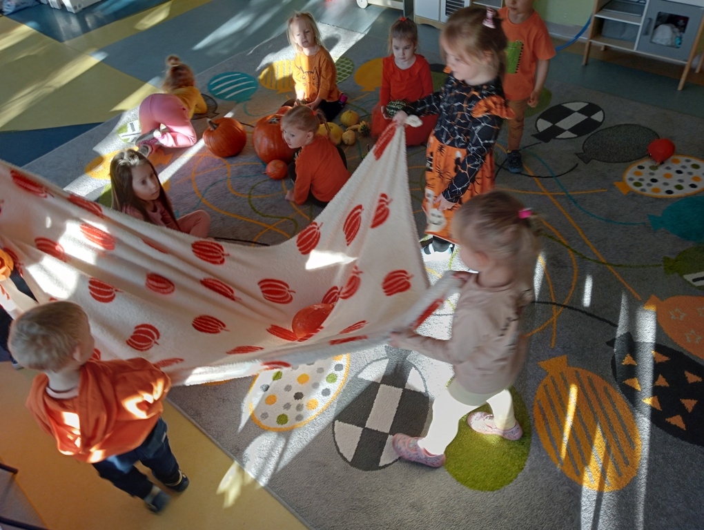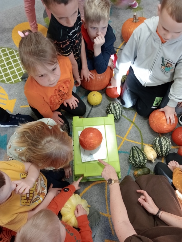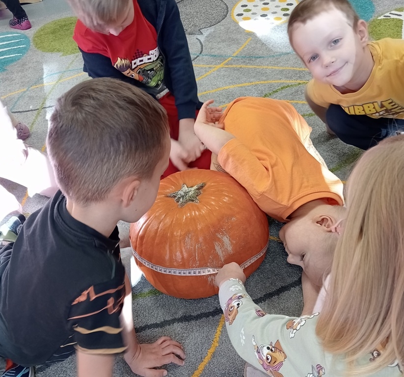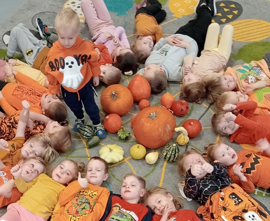 Dzień Dyni w obu grupach przedszkolnych był pełen pomarańczowych zabaw, warsztatów plastycznych i kulinarnych. Dzieci brały udział w konkurencjach, np. toczeniu dyni, bawiły się podczas „dyniowych” tańców, tworzyły nastrojowe lampiony. Dynia okazała się doskonałym materiałem badawczym – dzieci ważyły i mierzyły dynie, porównywały kolory i kształty oraz oglądały dynię po przekrojeniu.