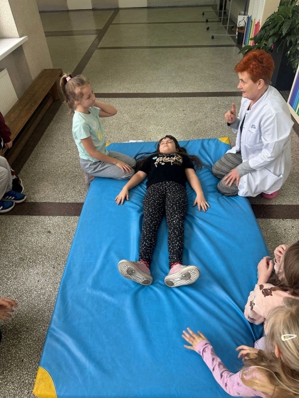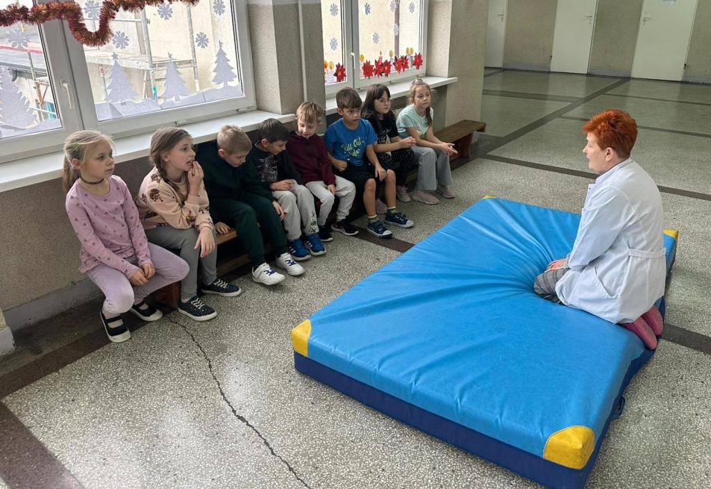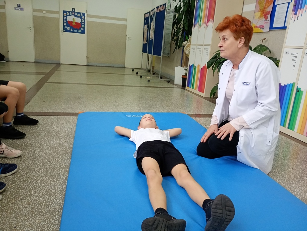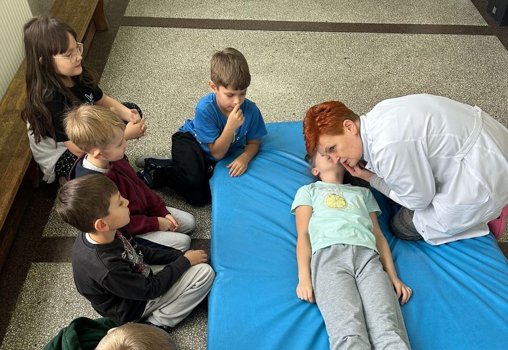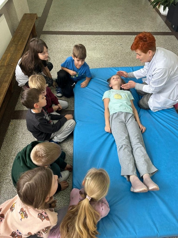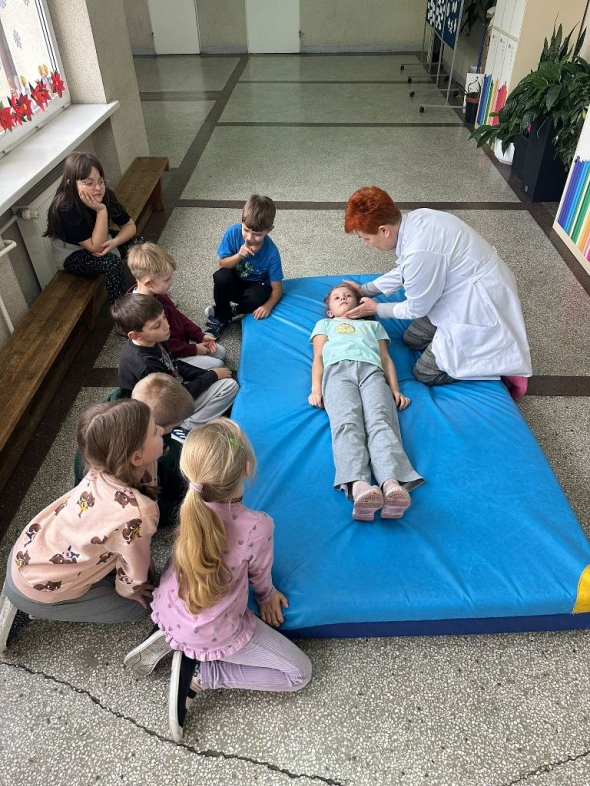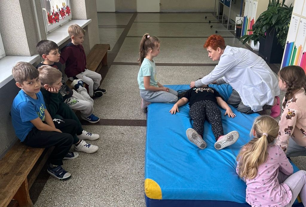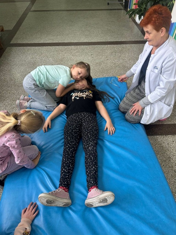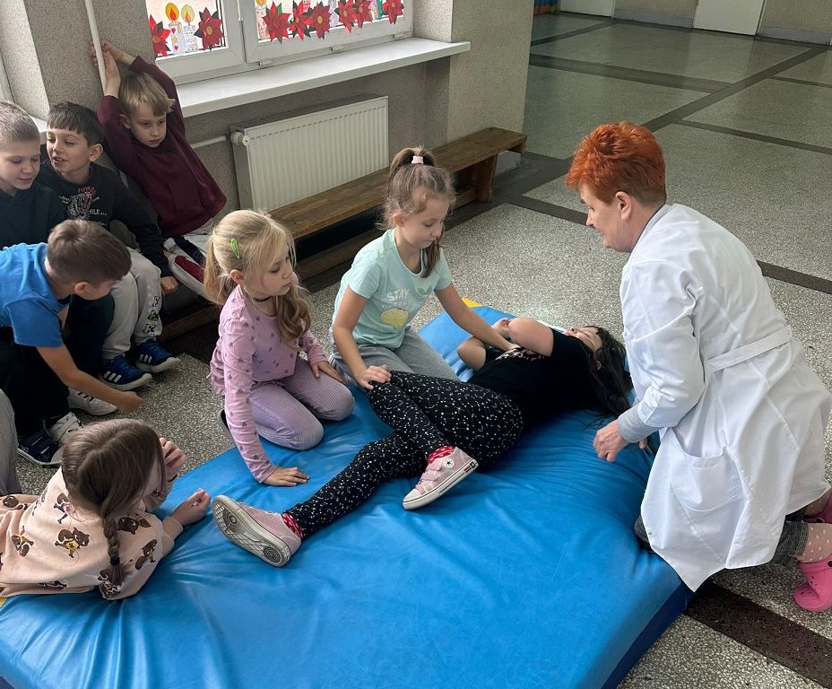 W dniach 25 listopada, 9 grudnia i 16 grudnia 2025r. odbyły się instruktażowe lekcje udzielania poszkodowanym pierwszej pomocy przedmedycznej. Poprowadziła je szkolna pielęgniarka – pani Gabriela Ciuk, a ich tematem była POZYCJA BOCZNA USTALONA.
