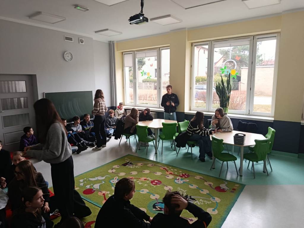 Dnia 17 marca 2026r. uczniowie klasy 8 wzięli udział w warsztatach prowadzonych przez uczennice IX Liceum Ogólnokształcącego im.. C.K. Norwida w Częstochowie. Zajęcia odbyły się w Konopiskach, a dotyczyły radzenia sobie ze stresem i trudnościami związanymi z podejmowaniem ważnych decyzji edukacyjnych, takich jak wybór szkoły ponadpodstawowej oraz przygotowanie do egzaminu ósmoklasisty.