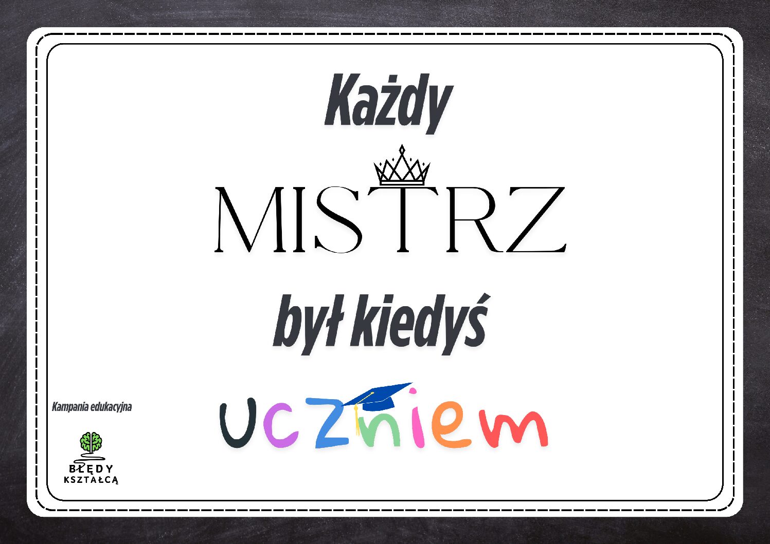 W kwietniu uczniowie naszej szkoły uczestniczyć będą w kampanii edukacyjnej „Błędy kształcą”. Jest to „inicjatywa skierowana do uczniów, rodziców i nauczycieli. Jej założeniem jest zmiana perspektywy nauczania i uczenia się poprzez aktywne wykorzystanie błędów jako nieodłącznej części procesu edukacyjnego. Oparta jest ona na przekonaniu, że każdy uczy się we własnym tempie, a popełnianie błędów nie jest porażką, lecz cenną lekcją, z której należy wyciągnąć wnioski, by się rozwijać.